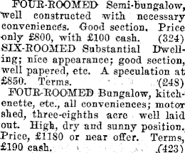 POUR-ROOMED Semi-bungalow, well constructed with necessary conveniences. Good section. Price ■only £BOO, with £lOO cash. (324) SIX-ROOMED Substantial Dwelling; nice appearance; good section, well papered, etc. A speculation at £B5O. Terms. (248) POUR-ROOMED Bungalow, kitchenette, etc., all conveniences; motor shed, three-eighths acre well laid out. High, dry and sunny position. Price, £llBO or near offer. Terms, £l9O cash. .(423)