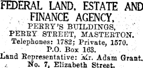 FEDERAL LAND, ESTATE AND FINANCE AGENCY, PERRY’S BUILDINGS, PERRY STREET, MASTERTON. Telephones: 1782; Private, 1570. P.O. Box 163. Land Representative: Mr. Adam Grant. No. 7, Elizabeth Street.
