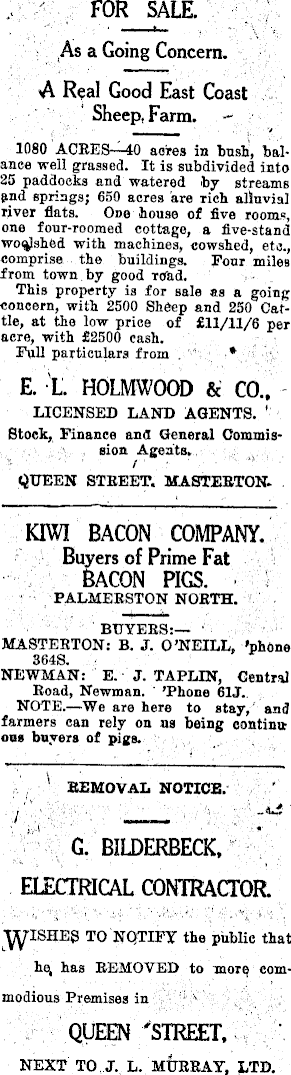 FOR SALE. As a Going Concern. A Real Good East Coast Sheep. Farm. 1080 ACRES—4O acres in bush, balance well grassed. It is subdivided into 25 paddocks and watered by streams {ind springs; 650 acres are rich alluvial river flats. One house of five room®, one four-roomed cottage, a five-stand woqjshed with machines, cowshed, etc., comprise the buildings. Four miles from town by good Ttfad. This property is for sale as a going concern, with 2500 Sheep and 250 Cattle, at the low price of £ll/11/6 per acre, with £2500 cash. Full particulars from . E. L HOLMWOOD & CO., LICENSED LAND AGENTS. ' Stock, Finance and General Commission Agents. QUEEN STREET. MASTERTON. KIWI BACON COMPANY. Buyers of Prime Fat BACON PIGS. PALMERSTON NORTH. BUYERS:— MASTERTON: B. J. O’NEILL, ’phone 3648. NEWMAN: E. J. TAPLIN, Central Road, Newman. ’Phone 61J. NOTE.—We are here to stay, and farmers can rely on us being continu one buyers of pigs. REMOVAL NOTICE. G. BILDERBECK, ELECTRICAL CONTRACTOR. TO NOTIFY the public that has REMOVED to more commodious Premises in QUEEN STREET, NEXT TO J. L. MURRAY, LTD.