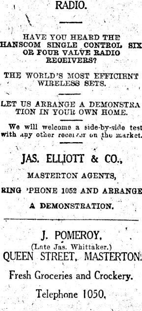 RADIO. HAVE YOU HEARD THE HANSCOM SINGLE CONTROL SIX OR FOUR VALVE RADIO RECEIVERS? THE WORLD’S MOST EFFICIENT WIRELESS SETS. LET US ARRANGE A DEMONSTKA TION IN YOUR OWN HOME. We will welcome a side-by-side test with any other reeel rur on the market. JAS. ELLIOTT & CO., MASTERTON AGENTS, RING ’PHONE 1052 AND ARRANGE A DEMONSTRATION. J. POMEROY, (Late Jas. Whittaker.) QUEEN STREET, MASTERTON. Fresh Groceries and Crockery. Telephone 1050.