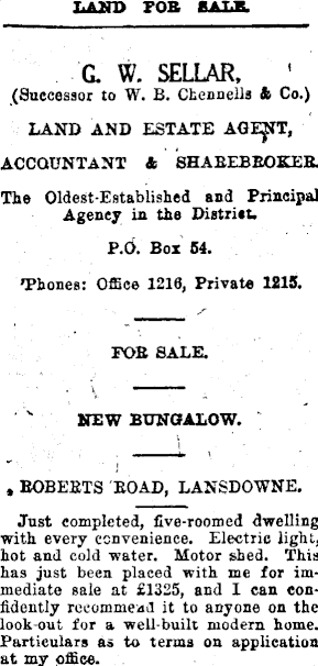 LAND FOB SALK G. W. SELLAR, (Successor to W. B. Chennells & Co.) LAND AND ESTATE AGENT, ACCOUNTANT & SHAREBROKER. The Oldest-Established and Principal Agency in the DistrisL P.O. Box 54. 'Phones: Office 1216, Private 1215. FOR SALE. NEW BUNGALOW. ' ROBERTS ROAD, LANSDOWNE. Just completed, five-roomed dwelling with every convenience. Electric light, hot and cold water. Motor shed. This has just been placed with me for immediate sale at £1325, and I can confidently reeommeml it to anyone on the look-out for a well-built modern home. Particulars as to terms on application at my office.