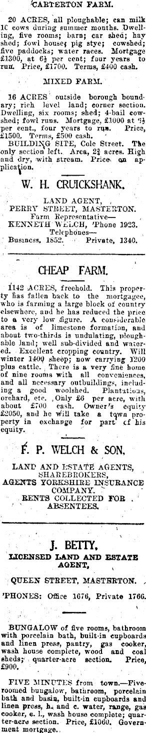 CARTERTON FARM. 20 ACRES, all ploughable; can milk 1C cows during summer months. Dwelling, five rooms; barn; car shed; hay shed; fowl house; pig stye; cowshed; five paddocks; water races. Mortgage £l3OO, at 6J per cent; four years to run. Price, £l7OO. Terms, £4OO cash. MIXED FARM. 16 ACHES outside borough boundary; rich level land; corner section. Dwelling, six rooms; shed; 4-bail cowshed; fowl runs. Mortgage, £lOOO at 5$ per cent., four years to run. Price, £l5OO. Terms, £5OO cash. BUILDING SITE, Cole Street. The only section left. Area, 2J acres. High and dry, with stream. Price on application. w. h. cruickshank. LAND AGENT, PERRY STREET, MASTERTON. Farm Representative— KENNETH WELCH, ’Phone 1923. Telephones— Business, 1852. Private, 1340. CHEAP FARM. 1142 ACRES, freehold. This property fias fallen back to the mortgagee, who is farming a large block of country elsewhere, and he has reduced the price to a very low figure. A considerable area is of limestone formation, and about two-thirds is undulating, ploughable land; well sub-divided and watered. Excellent cropping country. Will winter 1400 sheep; now carrying 1200 plus cattle. There is a very fine home of nine rooms with all conveniences, and all necessary outbuildings, including a good woolshed. Plantations, orchard, etc. Only £6 per acre, with about £7OO cash. Owner’s equity £2050, and he will take a town property in exchange for part cf his equity. F. P. WELCH & SON. LAND AND ESTATE AGENTS, SHAREBROKERS, AGENTS YORKSHIRE INSURANCE COMPANY. " RENTS COLLECTED FOB . ABSENTEES. J. BETTY, LICENSED LAND AND ESTATE AGENT, QUEEN STREET, MASTBRTON. ’PHONES: Office 1676, Private 1766. BUNGALOW of five rooms, bathroom with porcelain bath, built-in cupboards and linen press, pantry, gas cooker, wash house complete, wood and coal sheds; quarter-acre section. Price, £9OO. FIVE MINUTES from town. —Fiveroomed bungalow, bathroom, porcelain bath and basin, built-in cupboards and linen press, h. and c. water, range, gas cooker, e. 1., wash house complete; quar-ter-acre section. Price, £lO6O. Government mortgage.