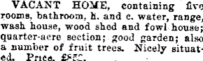 VACANT HOME, containing five rooms, bathroom, h. and c. water, range, wash house, wood shed and fowl house; quarter-acre section; good garden; also a number of fruit trees. Nicely situated. Price. £B’2.