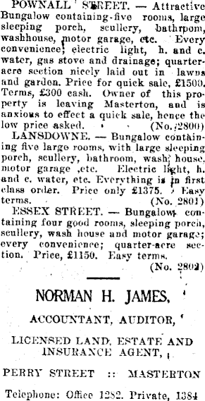 POWNALL STREET. — Attractive Bungalow containing-five rooms, large sleeping porch, scullery, batlirpom, washhouse, juotor garage, etc. Every convenience; electric light, h. and c. water, gas stove and drainage; quarteracre section nicely laid out in lawns .and garden. Price for quick sale. £1509. Terms, £3OO cash. Owner of this property is leaving Mastertom, and is anxious to effect a quick sale, hence the low price asked. (No. .2800) LANSDOWNE. — Bungalow cdntkining five large rooms, with large sleeping porch, scullery, bathroom, wash-; house, motor garage .etc. Electric light, h. and e. water, etc. Everything is jn first class order. Price only £1375. ■ Easy terras. ’ (No. 2801) ESSEX STREET. — Bungalows containing four good rooms, sleeping porch, scullery, wash house and motor garage; every convenience; quarter-acre section. Price, £ll5O. Easy terms. (No. 2802) NORMAN H. JAMES, ‘ ACCOUNTANT, AUDITOR, LICENSED LAND. ESTATE AND INSURANCE AGENT, ; PERRY STREET :: MASTERTON Telephone: Office 1282. Private, 1384