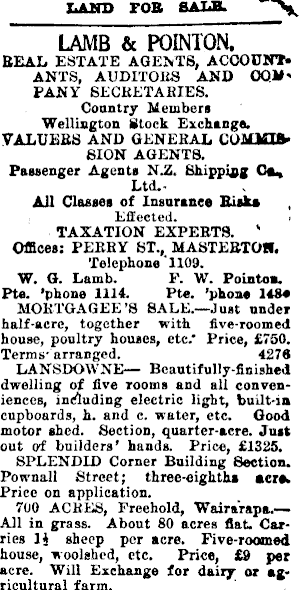 LAND FOB SALE. *"X LAMB & POINTON. BEAL ESTATE AGENTS, ACCOUNT* ANTS, AUDITORS AND OOMPANY SECRETARIES. Country Members Wellington Stock Exchange. VALUERS AND GENERAL COMMISSION AGENTS. Passenger Agents N.Z. Shipping Ca, Ltd. All Classes of Insurance Risks Effected. TAXATION EXPERTS. Offices: PERRY ST., MASTERTON. Telephone 1109. W. G. Lamb. F. W. Pointon. Pte. ’phone 1114. Pte. ’phone 148« MORTGAGEE’S SALE.—Just under half-aere, together with five-roomed house, poultry houses, etc.' Price, £750. Terms- arranged. 4276 LANSDOWNE— Beautifully-finished dwelling of five rooms and all conveniences, iniiluding electric light, built-in cupboards, h. and c. water, etc. Good motor shed. Section, quarter-acre. Just out of builders’ hands. Price, £1325. SPLENDID Corner Building Section. Pownall Street; three-eighths «er». Price on application. 700 ACRES, Freehold, Wairarapa.— All in grass. About 80 acres flat. Carries 14 sheep per acre. Five-roomed house, woolshed, etc. Price, £9 per acre. Will Exchange for dairy or agricultural farm.
