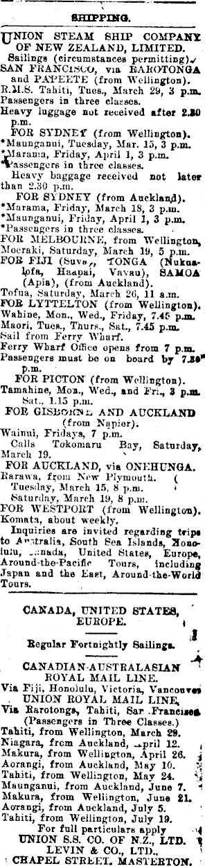 SHIPPING. TTNION STEAM SHIP COMPANY OF NEW ZEALAND, LIMITED. Sailings (circumstances permitting). , SAN FRANCISCO, via BAROTONGA and PAPEETE (from Wellington). R.M.B. Tahiti, Tues., March 29, 3 p.m. Passengers in three classes. Heavy luggage not received after 2.30 p.m. FOR SYDNEY (from Wellington). 'Maunganui, Tuesday, Mar. 15, 3 p.m. ’yilarania, Friday, April 1, 3 p.m. ‘n'assengers in three classes. Heavy baggage received not Jater than 2.30 p.m. FOR SYDNEY (from Auckland). 'Marama, Friday, March 18, 3 p.m. 'Maunganui, Friday, April I, 3 p.m. 'Passengers in three classes. FOB MELBOURNE, from Wellington, Moeraki, Saturday, March 19, 5 p.m. FOB FIJI (feuvs,, TONGA (Nukualofa, Haapai, Vavau ), SAMOA (Apia), (from Auckland). Tofua, Saturday, March 26, 11 a.m. FOB LYTTELTON (from Wellington). Wahine, Mon., Wed., Friday, 7.45 p m Maori, Tues., Thurs., Sat., 7.45 p.m. Sail from Ferry Wharf. Ferry Wharf Office opens from 7 p.m. Passengers must be on board by 7.BS* p.m. FOR PICTON (from Wellington). Tamahine, Mon., Wed., and Fri., 3 p.m. Sat., 1.15 p.m. FOB GISBOHNri AND AUCKLAND (from Napier). Wainui, Fridays, 7 p.m. Calls To-komaru Bay, Saturday, March 19. FOB AUCKLAND, via ONEHUNGA. Parana, from New Plymouth. ( Tuesday, March 15, 8 p.m. Saturday, March 19, 8 p.m. FOR WESTPORT (from Wellington). Komata, about weekly. Inquiries are invited regarding trips to South Sea Islands, Honolulu, inada, United States, Europe, Around-the-Pacific Tours, including Japan and the East, Around-the-World Tours. CANADA, UNITED STATES, EUROPE. | ? Regular Fortnightly Sailings. CANADIAN-AUSTRALASIAN ROYAL MAIL LINE. Via Fiji, Honolulu, Victoria, Vancouve* UNION ROYAL MAIL LINE, Via Rarotonga, Tahiti, Sar Franciaea (Passengers in Three Classes.) Tahiti, from Wellington, March 29. Niagara, from Auckland, l2. , Makura, from Wellington, April 26. , Aorangi, from Auckland, May 10. Tahiti, from Wellington, May 24. Maunganui, from Auckland, June 7. Makura, from Wellington, June 21. Aorangi, from Auckland, July 5. Tahiti, from Wellington, July 19. For full particulars apply j UNION S.S. CO. OF N.Z., LTD. i LEVIN & CO., LTD.. CHAPEL STREET. MASTERTON.