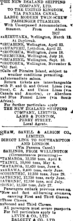 ’T’HE NEW ZEALAND SHIPPING COMPANY, LTD. TO THE UNITED KINGDOM, VIA PANAMA CANAL. LARGE MODERN TW’IN-SCREW PASSENGER STEAMERS. With Unsurpassed Accommodation. < Steamer. From About 1927 xxRIMUTAKA, Wellington, March 12. At Daybreak. 'tRUAHINE, Wellington, April 23. xxRUAPEHU, Lyttelton, April 22. 'tROTOBUA, Wellington, June 18. 'tREMUERA, Wellington, July 16. 'tRUAHINE, Wellington, Sept. 10. 'tROTORUA, Wellington. November 5. 'Oil fuel. i tCalls off Pitcairn Island, subject to weather conditions permitting, xxlntermediate saloon. Return tickets are interchangeable with P. and O. and Orient Lines (ns Suez), C. A. and Union Lines (via Canada and America), cr Aberdeen and Blue Funnel Lines (via South Africa). For further particular- apply THE NEW ZEALAND SHIPPING COMPANY, LIMITED. 4 LAMB & POINTON, PERRY' STREET. Local Acents CHAW, SAVILL & ALBION CO, LIMITED. DIRECT LINE TO SOUTHAMPTON AND LONDON (Via Panama Canal.) SAILINGS, FROM WELLINGTON (Circumstances permitting)— 'TAMAROA, 12,350 tons, April 9. 'TAINUI, 10,000 tons, May 4. 'MATAROA, 12,450 tons, June 4. xxARAWA, 9,400 tons, early June. tCORINTHIC, 12,350 tons, June 29. tATHENIC, 12,350 tons, early June. tATHENIC, 12,350 tons, mid July, tIONIC, 12,350 tons, July 27. Passengers embark previous evening. •New and fast oil-burning steamers, carrying First and Third Classes. (Three Classes. xxSecond and Third Classes. All passengers must secure passports. For full particulars apply to LEVIN & CO., LTD. DALGETY' k CO.. LTD.