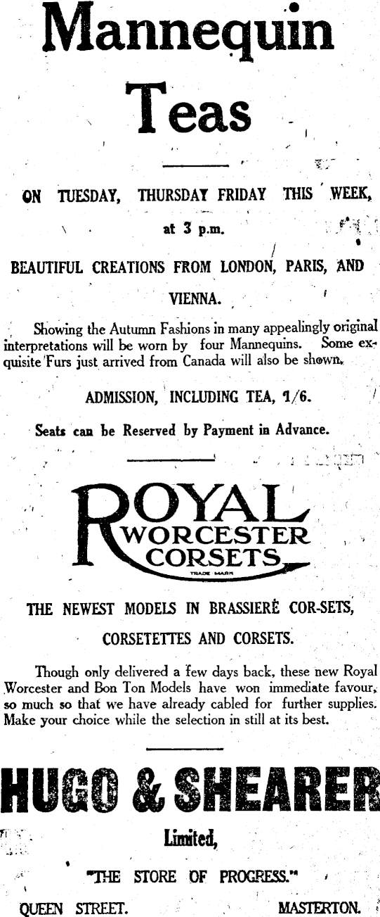 Mannequin Teas ON TUESDAY, THURSDAY FRIDAY THIS WEEK, at 3 p.m. ! s • BEAUTIFUL CREATIONS FROM LONDON, PARIS, AND VIENNA. Showing the Autumn Fashions in many appealingly original interpretations will be worn by four Mannequins. Some exquisite Furs just arrived from Canada will also be shown. ADMISSION, INCLUDING TEA, 1/6. Seats caa be Reserved by Payment in Advance. DOYAI. IVWORCESTER JL THE NEWEST MODELS IN BRASSIERE COR-SETS, CORSETETTES AND CORSETS. Though only delivered a few days back, these new Royal Worcester and Bon Ton Models have won immediate favour, so much so that we have already cabled for further supplies. Make your choice while the selection in still at its best. HUGO &SHEARER Limited, “THE STORE OF PROGRESS.” QUEEN STREET. MASTERTON.