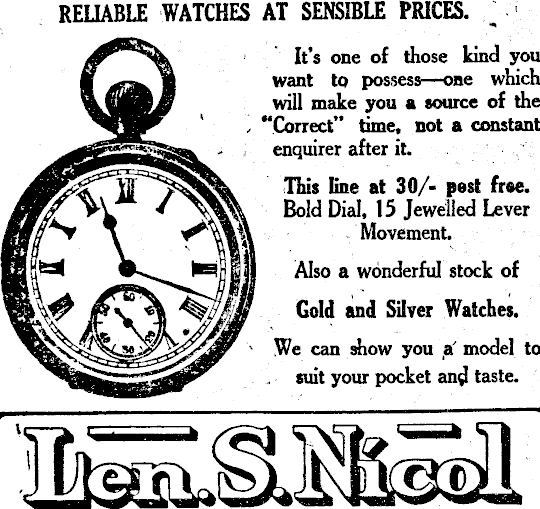 RELIABLE WATCHES AT SENSIBLE PRICES. It’s one of those kind you ■ ■ want to possess—one which WUMf will make you a source of the “Correct” time, not a constant enquirer after it. This line at 30/- pest free. pY / Bold Dial, 15 Jewelled Lever \ Movement. Also a wonderful stock of Gold si lver Watches. We can show you a model to suit your pocket and taste. /oil Yl :| Ifl _ < J I