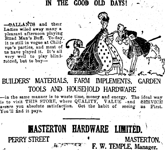 IN THE GOOD OLD DAYS! - —<JALLAJ?TS and their vy Ladies wiled away many a pleasant afternoon playing * Blind Man’s Buff. To-day, it is still in vogue at Child- { &&& vK TQn’s parties, and most of 8 x\f\ - us nave played it. It’s all JmS Z *Vl\ very well to play blind- s ■ folded, but to buy— • RfX l/l I '7? n J®] 111 J BUILDERS’ MATERIALS, FARM IMPLEMENTS, GARDEN TOOLS AND HOUSEHOLD HARDWARE —in the same manner is to waste time, money and energy. The ideal way is to visit THIS STORE, where QUALITY, VALUE -and SERVICE assure you absolute satisfaction. Get the habit of seeing us First. You’ll find it pays. * ■ASTERTON HARDWARE LIMITED. PERRY STREET • MASTERTON. F. W. TEMPLE, Manager.