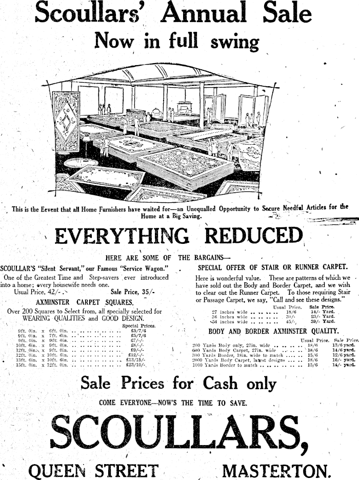 Scoullars’ Annual Sale Now in full swing W Ma. gg W l. r I - JET; : This is the Eevent that all Home Furnishers have waited for—an Unequalled Opportunity to Secure Needful Articles for the Home at a Big Saving. — EVERYTHING REDUCED HERE ARE SOME OF THE BARGAINS—SCOULLAR’S “Silent Servant,” our Famous “Service Wagon.” SPECIAL OFFER OF STAIR OR RUNNER CARPET. One of the Greatest Time and Step-savers . ever introduced Here is wonderful value. These are patterns of which we into a home; every housewife needs one. have sold out the Body and Border Carpet, and we wish Usual Price, 42/- . Sale Price, 35/- to clear out the Runner Carpet. To those requiring Stair AXMINSTER CARPET SQUARES. or Passa S e Car P et ’ we sa y> “C* ll andsee 111656 designs.” Over 200 Squares to Select from, all specially selected for 27 inches wide isl 4- Yard. WEARING QUALITIES and GOOD DESIGN. ££ Special Prices. 9ft. Oin. x Gft. Oin £5/7/6 BODY AND BORDER AXMINSTER QUALITY. 9ft. Oin. x 7ft. <sin. .. £5/7/6 9ft. Oin. x 9ft'. Oin £7/-/- Usual Price. Sulu Price. 10ft. Gin. x 9ft. Oin £B/-/- 200 Yards Body only, 27in. wide 18/6 13/6yard. 12ft. Oin. x 9ft. Oin £9/-/- 600 Yards Body Carpet, 27in. wide JS/6 14/6yard. 12ft. Oin. x 10ft. 6in £l2/-/- 300 Yards Border, 18in. wide to match 15/6 12/6 yard. e 13ft. Gin. x 10ft. 6in £l3/15/- 2000 Yards Body Carpet, latest designs 18/6 16/- yard. 15ft. Oin. x 12ft. Oin £23/10/- ' 1000 Yards Border to match 15/6 14/- yard. Sale Prices for Cash only COME EVERYONE—NOW’S THE TIME TO SAVE. SCOULLARS, QUEEN STREET MASTERTON.