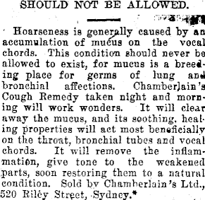 SHOULD NOT BE ALLOWED. . Hoarseness is generally caused by an accumulation of mucus on the vocal chords. This condition should never bo allowed to exist, for mucus is a breeding place for germs of lung and bronchial affections. Chamberlain’s Cough Remedy taken night and morning will work wonders. It will clear away the mucus, and its soothing, healing properties will act most beneficially on the throat, bronchial tubes and vocal chords. It will remove the inflammation, give tone to the weakened parts, soon restoring them to a natural condition. Sold by Chamberlain’s Ltd., 520 Riley Street, Sydney.*