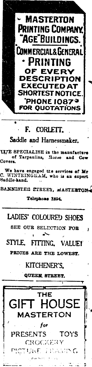 MASTERTON ■ Printing Comrany ■ ~Age"Buildings. ■Cdmmercial&General a Printing OF EVERY ■ DESCRIPTION ~ EXECUTED AT ■ SHORTEST NOTICE V PHONE 1087 » FOR QUOTATIONS F. CORLED. Saddle and Hamessmaker, ITI/E SPECIALISE in the manufaetwre of Tarpaulins, Horje and Cow Covers. We have engaged tte services of Mr C. WINTEING HAM, who is an expert Saddle-hand. BANNISTEIS ETREEI, ASTEBTQff Telephone 189 L LADIES’ COLOURED SHOES SEE OUR SELECTION FOB STYLE. FITTING, VALUE! PRICES ARE THE LOWEST. KITCHENER’S, QUEEN STREET. THE GIFT HOUSE MASTERTON | ' foe h PRESENTS TOYS