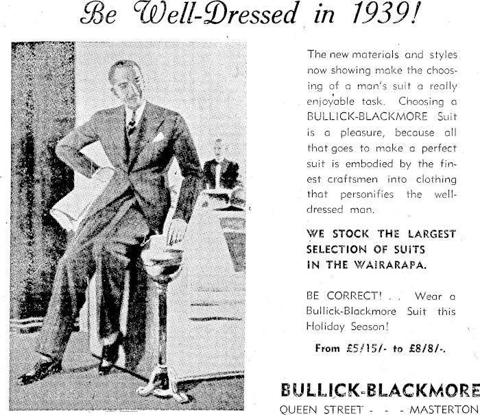 9de ell-2)ressed in 1939! new materials and styles ' now showing make the choosa rr ' ar|/s sl| T a really I enjoyable task. Choosing a BULLICK-BLACKMORE Suit is a pleasure, because all u that goes to make a perfect suit is embodied by the fin- " est craftsmen into clothing that personifies the wellNMjF - 1 ? * i ** , * l ‘‘ c dressed man. WE STOCK THE LARGEST selection of suits C'/W IN THE WAIRARAPA. HKwBF A CORRECT! . . Wear a T Bullick-Blackmore Suit this H Holiday Season! 1 From £5/15/- to £B/8/-. BULLICK BLACKMORE QUEEN STREET - - - MASTERTON