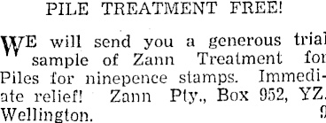PILE TREATMENT FREE! VWE will send you a generous trial sample of Zann Treatment for Piles for ninepence stamps. Immediate relief! Zann Pty., Box 952, YZ. Wellington. 9