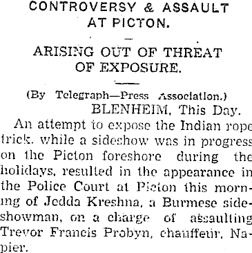 CONTROVERSY & ASSAULT AT PICTON. ARISING OUT OF THREAT OF EXPOSURE. (By Telegraph—Press Zissociatlon.) BLENHEIM, This Day. An attempt to expose the Indian rope trick. while a sideshow was in progress on the Picton foreshore during the holidays, resulted in the appearance in the Police Court al Picton this morning of Jcdda Kreshna, a Burmese sideshowman, on a charge of assaulting Trevor Francis Probyn, chauffeur, Napier.