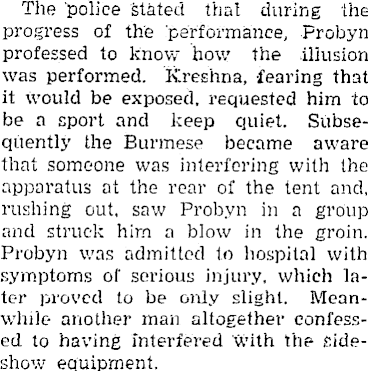 The police stated that during the progress of the performance, Probyn professed to know how the illusion was performed. Kreshna, fearing that it would be exposed, requested him to be a sport and keep quiet. Subsequently the Burmese became aware that someone was interfering with the apparatus at the rear of the tent and, rushing out, saw Probyn in a group and struck him a blow in the groin. Probyn was admitted to hospital with symptoms of serious injury, which later proved to be only slight. Meanwhile another man altogether confessed to having interfered with the sideshow equipment.