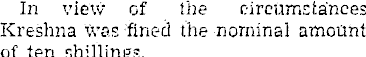In view of the circumstances Kreshna was fined the nominal amount of ten shillings.