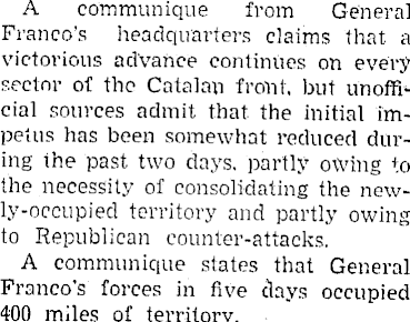 A communique from General Franco's headquarters claims that a victorious advance continues on every sector of the Catalan front, but unofficial sources admit that the initial impetus has been somewhat reduced during the past two days, partly owing to the necessity of consolidating the new-ly-occupied territory and partly owing to Republican counter-attacks. A communique states that General Franco's forces in five days occupied 400 miles of territory.