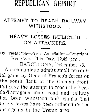 REPUBLICAN REPORT ATTEMPT TO REACH RAILWAY WITHSTOOD. HEAVY LOSSES INFLICTED ON ATTACKERS. By Telegraph—Press Association—Copyright. (Received This Day, 12.4'5 p.m.) BARCELONA. December 28. A communique admits small territorial gains by General Franco’s forces On the south flank of the Catalan front, but says the attempt to reach the Leri-da-Tarrngona main road and railway has been withstood and claims that heavy losses have been inflicted on the insurgents in the Tremp area.