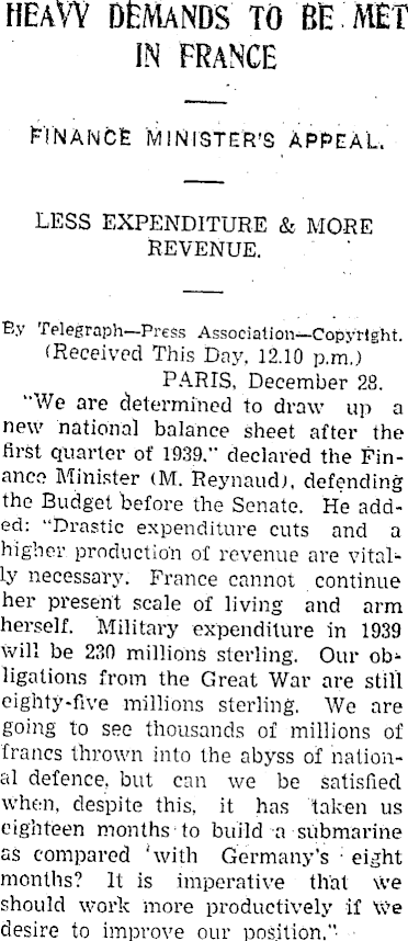 heavy demands to be met IN FRANCE I Finance minister’s Appeal. LESS EXPENDITURE & MORE REVENUE. By Telegraph—Press Association—Copyright. (Received This Day. 12.10 p.m.) PARIS, December 28. “We are determined to draw up a new national balance sheet after the first quarter of 1939." declared the Finance Minister (M. Reynaud), defending the Budget before the Senate. He added: “Drastic expenditure cuts and a higher production of revenue are vitally necessary. France cannot continue her present scale of living and arm herself. Military expenditure in 1939 will be 230 millions sterling. Our obligations from the Great War are still eighty-five millions sterling. We are going to see thousands of millions of francs thrown into the abyss of national defence, but can we be satisfied when, despite this, it has taken us eighteen months to build a submarine as compared 'with Germany's eight months? It is imperative that we should work more productively if We desire to improve our position."