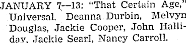 JANUARY 7—13: “That Certain Age,” Universal. Deanna Durbin, Melvyn Douglas, Jackie Cooper, John Halliday, Jackie Searl, Nancy Carroll.