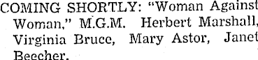 COMING SHORTLY: “Woman Against Woman,” M.G.M. Herbert Marshall, Virginia Bruce, Mary Astor, Janet Beecher.