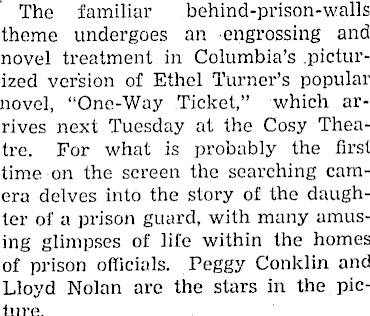 The familiar behind-prison-walls theme undergoes an engrossing and novel treatment in Columbia’s picturized version of Ethel Turner’s popular novel, “One-Way Ticket,” which arrives next Tuesday at the Cosy Theatre. For what is probably the first time on the screen the searching camera delves into the story of the daughter of a prison guard, with many amusing glimpses of life within the homes of prison officials. Peggy Conklin and Lloyd Nolan are the stars in the picture.