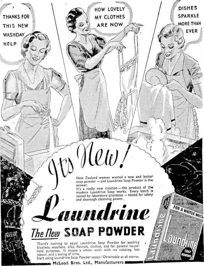: b Z ” I \ HOW LOVELY' / S DISHES ' THANKS FOR | \ MY CLOTHES j / ( SPARKLE THIS NEW 1 \ ARE NOW / Z -'~;' MORETHAN ■zbr \ /W" f f; ■' aA 1- Z f Oliiw Lz' ... ■ / ZW' Xw I i 1 k■ \ /W / ■ Uew \ij bw lifcfzLCW 1 New Zealand women wanted a new and better I soap powder — and Laundrine Soap Powder the Zb? a really new creation —the product of the Ary modern Laundrine Soap works. Every batch is 4b tested by laboratory processes - tested for safety \A/ di ■ • and thorough cleansing power. W JLtiiuidrine Ssl 111 7Ag/7m SOAP POWDER There’s nothing to equal Laundrine Soap Powder for washing , blankets, woollens, silks, flannels, clothes, and for general household purposes. It means a whiter wash with no rubbing, less labour, and a saving of time. . Start using Laundrine Soap Powder today ! Obtainable at all stores. , i i McLeod Bros. Ltd., Manufacturers