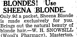 BLONDES! Use SHEENA BLONDE. Only 9d a packet, Sheena Blonde is made exclusively for you. Brings out the natural beauty of blonde hair. —W. H. SNOWSILL (Wood’s Pharmacy), Masterton. •