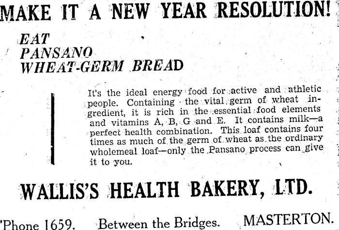 MAKE IT A NEW YEAR RESOLUTION! ] EAT 1 PANSANO WHEAT-GERM BREAD It’s the ideal energy food for active and athletic people. Containing the vital germ of wheat ingredient, it is rich in the essential food elements -j and vitamins A, B, G and E. It contains milk a j perfect health combination. This loaf contains four , times as much of the germ of wheat as the ordinary wholemeal loaf —only the Pansano process can ..give j it to you. , -j WALLIS’S HEALTH BAKERY, LTD. ■ 'Phone 1659. Between the Bridges. MASTERTON.