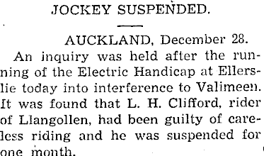 JOCKEY SUSPENDED. AUCKLAND, December 28. An inquiry was held after the running of the Electric Handicap at Ellerslie today into interference to Valimeen. It was found that L. H. Clifford, rider of Llangollen, had been guilty of careless riding and he was suspended for one month.