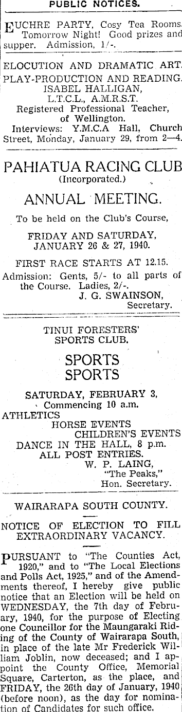 PUBLIC NOTICES. VUCHRE PARTY, Cosy Tea Rooms. Tomorrow Night! Good prizes and supper. Admission. 1/-. ELOCUTION AND DRAMATIC ART. PLAY-PRODUCTION AND READING. ISABEL HALLIGAN, L.T.C.L., A.M.R.S.T. Registered Professional Teacher, of Wellington. Interviews: Y.M.C.A Hall, Church Street, Monday, January 29, from 2 —4. PAHIATUA RACING CLUB (Incorporated.) ANNUAL MEETING. To be held on the Club’s Course, FRIDAY AND SATURDAY, JANUARY 26 & 27, 1940. FIRST RACE STARTS AT 12.15. Admission: Gents, 5/- to all parts of the Course. Ladies, 2/-. J. G. SWAINSON, Secretary. TINUI FORESTERS’ SPORTS CLUB. SPORTS SPORTS SATURDAY, FEBRUARY 3, Commencing 10 a.m. ATHLETICS HORSE EVENTS CHILDREN’S EVENTS DANCE IN THE HALL, 8 p.m. ALL POST ENTRIES. W. P. LAING, “The Peaks,” Hon. Secretary. WAIRARAPA SOUTH COUNTY. NOTICE OF ELECTION TO FILL EXTRAORDINARY VACANCY. PURSUANT to “The Counties Act, X 1920,” and to “The Local Elections and Polls Act, 1925,” and of the Amendments thereof, I hereby give public notice that an Election will be held on WEDNESDAY, the 7th day of February, 1940, for the purpose of Electing one Councillor for the Maungaraki Riding of the County of Wairarapa South, in place of the late Mr Frederick William Joblin, now deceased; and I appoint the County Office, Memorial Square, Carterton, as the place, and FRIDAY, the 26th day of January, 1940 (before noon), as the day for nomination of Candidates for such office.