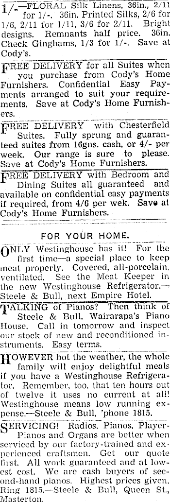 T /_—FLORAL" Silk "Linens, 36in„ 2/11 " for 1/-. 36in. Printed Silks, 2/6 for 1/6, 2/11 for 1/11. 3/6 for 2/11. Bright designs. Remnants half price. 36in. Check Ginghams, 1/3 for 1/-. Save at Cody’s. PREE’DELIVERY for all Suites when you purchase from Cody’s Home Furnishers. Confidential Easy Payments arranged to suit your requirements. Save at Cody’s Home Furnishers. pREE DELIVERY with Chesterfield A Suites. Fully sprung and guaranteed suites from 16gns. cash, or 4/- per week. Our range is sure to please. Save at Cody’s Home Furnishers. pREE DELIVERY with Bedroom and Dining Suites all guaranteed and available on confidential easy payments if required, from 4/6 per wek. Sava at Cody’s Home Furnishers. FOR YOUR HOME. ONLY Westinghouse has it! For the first time—a special place to keep meat properly. Covered, all-porcelain, ventilated. See the Meat Keeper in the new Westinghouse Refrigerator.— Steele & Bull, next Empire Hotel. Pianos? Then think of Steele & Bull. Wairarapa’s Piano House. Call in tomorrow and inspect our stock of new and reconditioned instruments. Easy terms. J.JOWEVER hot the weather,"the whole family will enjoy delightful meals if you have a Westinghouse Refrigerator. Remember, too. that ten hours out of twelve it uses no current at all! Westinghouse means low running expense. —Steele & Bull, ’phone 1815. SERVICING! Radios." Pianos. PlayerPianos and Organs are better when serviced by our factory-trained and experienced craftsmen. Get our quote first. All work guaranteed and at lowest cost. We are cash buyers of sec-ond-hand pianos. Highest prices given.] Ring 1815. —Steele & Bull, Queen St.,! Masterton.