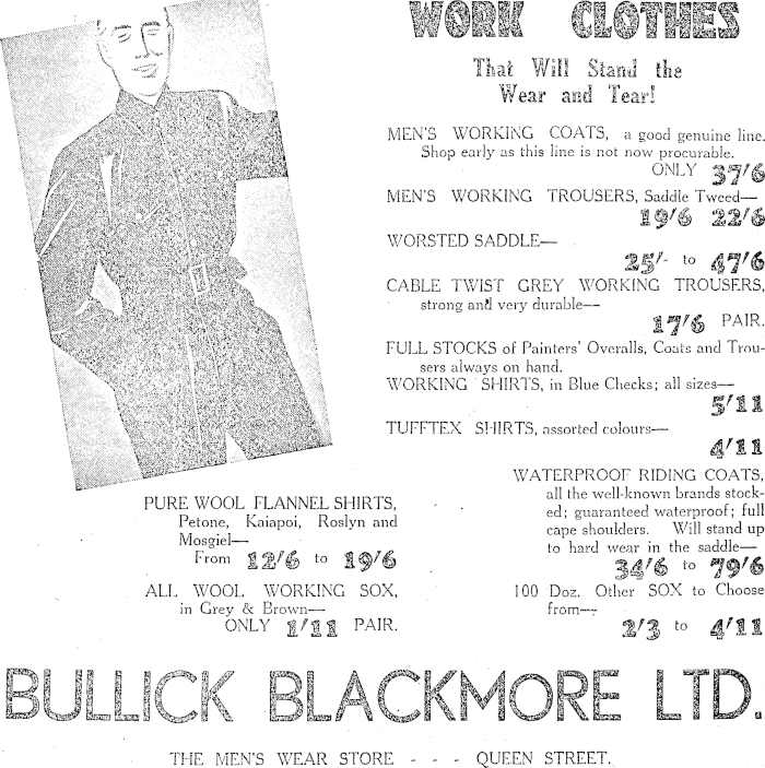 - ; pf W@iS CWFIE3 \ ", ' That Will Stand the Wear and Tear! MEN ' S WORKING COATS, a good genuine line. B v /C z s Shop early as this line is not now procurable. ItO only MEN’S WORKING TROUSERS. Saddle Tweed— WORSTED SADDLE—- ’ . . 2F io w CABLE TWIST GREY WORKING TROUSERS, i strong and very durable—- ® ■ ■ , > ’ m PA,R - FULL STOCKS of Painters’Overalls, Coats and TrouWORKING^SHRTS,''hi Blue Checks; all sizes—--s'll TUFFTEX SHIRTS, assorted colours- ’ .... 4'll WATERPROOF RIDING COATS, PURE WOOL FLANNEL SHIRTS Petone, Kaiapoi, Roslyn and cape shoulders Will stand up 1 p S^ie m lo hard wear in the saddle—1W to 19'6 34/s t o ALL WOOL WORKING SOX, 100 Doz. Other SOX to Choose in Grey & Brown— from—--ONLY I/O PAIR. X 3 to 4'll Bl li I Di I TH Sece to® a 0%. y v I I 0 Szs33 sees) i a THE MEN’S WEAR STORE - - - QUEEN STREET.