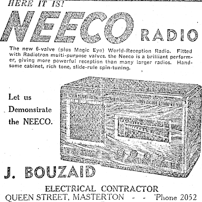HERE IT IS! RADIO T| ie new 6-valve (plus Magic Eye) World-Reception Radio. Fitted wi h Radiotron multi-purpose valves, the Neeco is a brilliant performer, giving more powerful reception than many larger radios. Handsome cabinet, rich tone, slide-rule spin-tuning. Demonstrate 5 the NEECO. J. ELECTRICAL CONTRACTOR QUEEN STREET, MASTERTON - - ’Phone 2052