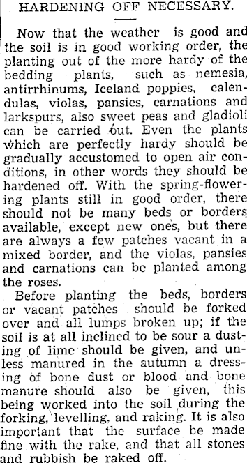 HARDENING OFF NECESSARY. Now that the weather is good and the soil is in good working order, the planting out of the more hardy of the bedding plants, such as nemesia, antirrhinums, Iceland poppies, calendulas, violas, pansies, carnations and larkspurs, also sweet peas and gladioli can be carried but. Even the plants which are perfectly hardy should be gradually accustomed to open air conditions, in other words they should be hardened off. With the spring-flower-ing plants still in good order, there should not be many beds or borders available, except new ones, but there are always a few patches vacant in a mixed border, and the violas, pansies and carnations can be planted among the roses. Before planting the beds, borders or vacant patches should be forked over and all lumps broken up; if the ’soil is at all inclined to be sour a dusting of lime should be given, and unless manured in the autumn a dressing of bone dust or blood and bone manure should also be given, this being worked into the soil during the forking, levelling, and raking. It is also important that the surface be made fine with the rake, and that all stones and rubbish be raked off.
