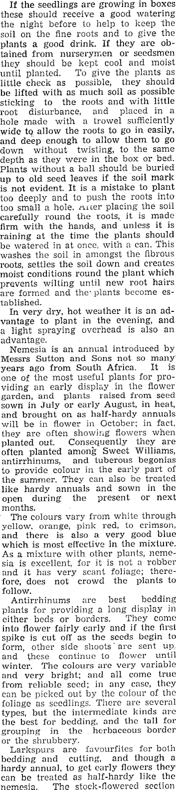 If the seedlings are growing in boxes these should receive a good watering the night before to help to keep the soil on the fine roots and to give the plants a good drink. If they are obtained from nurserymen or seedsmen they should be kept cool and moist until planted. To give the plants as little check as possible, they should be lifted with as much soil as possible sticking to the roots and with little root disturbance, and placed in a hole made with a trowel sufficiently wide to allow the roots to go in easily, and deep enough to allow them to go down without twisting, to the same depth as they were in the box or bed. Plants without a ball should be buried up to old seed leaves if the soil mark is not evident. It is a mistake to plant too deeply and to push the roots intotoo small a hole, zixcer placing the soil carefully round the roots, it is made firm with the hands, and unless it is raining at the time the plants should be watered in at once, with a can. This washes the soil in amongst the fibrous roots, settles the soil down and creates moist conditions round the plant which prevents wilting until new root hairs are formed and the plants become established. In very dry, hot weather it is an advantage to plant in the evening, and a light spraying overhead is also an advantage. Nemesia is an annual introduced by Messrs Sutton and Sons not so many years ago from South Africa. It is one of the most useful plants for providing an early display in the flower garden, and plants raised from seed sown in July or early August, in heat, and brought on as half-hardy annuals will be in flower in October; in fact, they are often showing flowers when planted out. Consequently they are often planted among Sweet Williams, antirrhinums, and tuberous begonias to provide colour in the early part of the summer. They can also be treated like hardy annuals and sown in the open during the present or next months. The colours vary from white through yellow, orange, pink red, to crimson, and there is also a very good blue which is most effective in the mixture. As a mixture with other plants, nemesia is excellent, for it is not a robber and it has very scant foliage; therefore, does not crowd the plants to follow. Antirrhinums are best bedding plants for providing a long display in either beds or borders. They come into flower fairly early and if the first spike is cut off as the seeds begin to form, other side shoots' are sent up, and these continue to flower until winter. The colours are very variable and very bright; and all come true from reliable seed; in any case, they can be picked out by the colour of the foliage as seedlings. There are several types, but the intermediate kinds are the best for bedding, and the tall for grouping in the herbaceous border or the shrubbery. Larkspurs are favourfites for both bedding and cutting, and though a hardy annual, to get early flowers they can be treated as half-hardy like the nemesia. The stock-flowered section