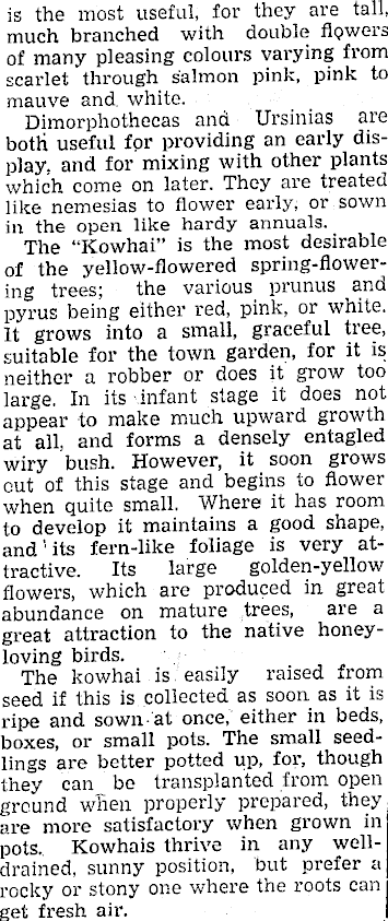 is the most useful, for they are tall, much branched with double fipwers of many pleasing colours varying from scarlet through salmon pink, pink to mauve and white. Dimorphothecas and Ursinias are both useful for providing an early display. and for mixing with other plants which come on later. They are treated like nemesias to flower early, or sown in the open like hardy annuals. The “Kowhai” is the most desirable of the yellow-flowered spring-flower-ing trees; the various prunus and pyrus being either red, pink, or white. It grows into a small, graceful tree, suitable for the town garden, for it is neither a robber or does it grow too large. In its infant stage it does not appear to make much upward growth at all, and forms a densely entagled wiry bush. However, it soon grows cut of this stage and begins to flower when quite small. Where it has room to develop it maintains a good shape, and its fern-like foliage is very attractive. Its large golden-yellow flowers, which are produced in great abundance on mature trees, are a great attraction to the native honeyloving birds. The kowhai is easily raised from seed if this is collected as soon as it is ripe and sown at once, either in beds, boxes, or small pots. The small seedlings are better potted up, for, though they can be transplanted from open ground when properly prepared, they are more satisfactory when grown in pots. Kowhais thrive in any welldrained, sunny position, but prefer a rocky or stony one where the roots can get fresh air.