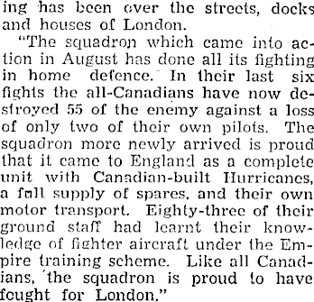 ing has been ever the streets, clocks and houses of London. “The squadron which came into action in August has done all its fighting in home defence. In their last six fights the all-Canadians have now destroyed 55 of the enemy against a loss of only two of their own pilots. The squadron more newly arrived is proud that it camo to England as a complete unit with Canadian-built Hurricanes, a full supply of spares, and their own motor transport. Eighty-three of their ground staff had learnt their knowledge of fighter aircraft under the Empire training scheme. Like all Canadians, the squadron is proud to have fought for London.”