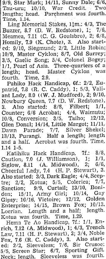 9/9, Star Mark; 14/11, Sunny Dale; 6/6, Tau-uru; 10/10, War Credit. Two lengths; head. Parchment was fourth. Time, 1.14. Ling Memorial Stakes, I jm.: 4/3, The Buzzer, 8.7 (D. W. Redstone), 1; 7/6, Meamea, 7.11 (C. G. Goulsbro), 2; 6/8, Homily, 7.9 (K. Chote), 3. Also started: 9/10, Siegmund; 2/2, Little Robin; 10/9, Master Cyklon; 8/7, Old Surrey; 3/5, Gaelic Song; 5/4, Colonel Bogey; 1/1, Pearl of Asia. Three-quarters of a length; head. Master Cyklon was fourth. Time, 2.9. Pahiko Hack Handicap, 6f.: 2/2, Eupatrid, 7.8 (R. C. Caddy), 1; 5/3, Valiant Lady, 8.0 ((W. J. Mudford), 2; 9/10, Newbury Queen, 7.7 (D. W. Redstone), 3. Also started: 8/8, Filbert; 1/1, Counter; 6/6 Acrobat; 4/4, Waimutu; 10/8, Conversion; 3/5, Taiho; 12/12, Glen Donal; 14/14, Little Margot; 11/11, Dawn Parade; 7/7, Silver Shekel; 13/13, Purangi. Half a length; length and a half. Acrobat was fourth. Time, 1.14 1-5. Katihiku Hack Handicap, 7f.: 8/8, Caution; 7.0 (J. Williamson), 1; 1/1, Siglow, 8.11 (A. Midwood), 2; 6/6, Cheerful Lady, 7.4 (H. P. Stewart), 3. Also started: 3/3, Dark Eagle; 4/4, Sceptre; 2/2, Kotua; 5/5, Colerica; 7/7, Sanction; 9/9, Curtail; 13/10, Boniden; 15/11, Army Girl; 10/14, Gay Gipsy; 16/16, Victoire; 12/12, Golden Enterprise; 14/15, Brown Fox; 10/13. Locrian. Length and a half; length. Kotua was fourth. Time, 1.29. Hema Te Ao Handicap, 7f.: 1/1, Enrich. 7.12 (A. Midwood), 1; 4/3, Trench Law, 7.11 (H. P. Stewart), 2; 3/4, Noble Fox, 7.6 (R. C. Caddy), 3. Also started: 2/2, Sleeveless; 7/6, Sir Crusoe: 5./5, Screen Star; 6/7, Sporting Gift. Neck: length. Sleeveless was fourth.