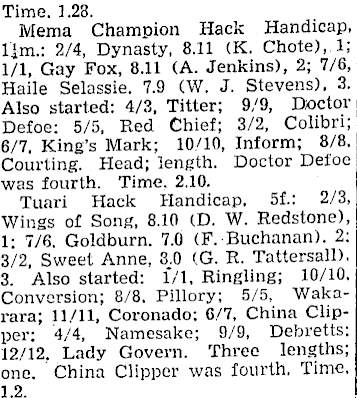 Time. 1.28. Merna Chamuion Hack Handicap, Ijm.: 2/4, Dynasty, 8.11 (K. Chote), 1; 1/1, Gay Fox, 8.11 (A. Jenkins), 2; 7/6, Haile Selassie. 7.9 (W. J. Stevens). 3. Also started; 4/3, Titter; 9/9, Doctor Defoe; 5/5, Red Chief; 3/2, Colibri; 6/7, King’s Mark; 10/10, Inform; 8/8. Courting. Head; length. Doctor Defoe was fourth. Time. 2.10. Tuari Hack Handicap, 5f.: 2/3, Wings of Song, 8.10 (D. W. Redstone), 1- 7/6. Goldburn. 7.0 (F. Buchanan). 2; 3/2, Sweet Anne, 3.0 (G. R. Tattersail). 3. Also started: 1/1, Ringling; 10/10. Conversion; 8/8. Pillory; 5/5, Wakarara; 11/11, Coronado; 6/7, China Clipper: 4/4, Namesake; 9/9, Debretts: 12/12. Lady Govern. Three lengths; one. China Clipper was fourth. Time. 1.2.