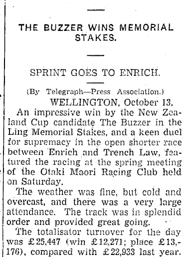 Enrich Rehandicapped. Enrich has been rehandicapped to 8.3 in the Grandstand Handicap at the Masterton meeting. An Impressive Win. The Buzzer won the Ling Memorial at Otaki on Saturday in an impressive manner. Always well placed, and never further back than fourth, he went up to the pacemaker, Old Surrey, at the half when his rider found others trying to get past him, and staying there to the entrance to the straight he then drew ahead. He had the race won immediately he took charge, but challenges by Meamea and Homily caused’ his rider to give him a kick. He immediately responded, and finally he was being eased up to win handsomely from Meamea and Homily, who were only heads apart, in front of Master Cyklon. The best of the others were Little Robin, Old Surrey and Pearl of Asia. Little Robin and Pearl of Asia tailed the field in all the running and were too far back in the fast run race ever to have any chance.