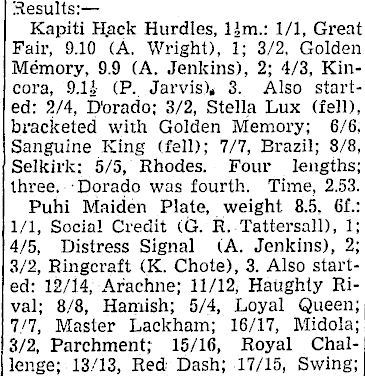 Results: — Kapiti Hack Hurdles, lJm.: 1/1, Great Fair, 9.10 (A. Wright), I; 3/2. Golden Memory, 9.9 (A. Jenkins), 2; 4/3, Kincora, 9.14 (P. Jarvis), 3. Also started: 2/4, Dorado; 3/2, Stella Lux (fell), bracketed with Golden Memory; 6/6. Sanguine King (fell); 7/7, Brazil; 8/8, Selkirk; 5/5, Rhodes. Four lengths; three. Dorado was fourth. Time, 2.53. Puhi Maiden Plate, weight 8.5, 6f.: 1/1, Social Credit (G. R. Tattersail), 1; 4/5, Distress Signal (A. Jenkins), 2; 3/2, Ringcraft (K. Chote), 3. Also started: 12/14, Arachne; 11/12, Haughty Rival; 8/8, Hamish; 5/4, Loyal Queen; 7/7, Master Lackham; 16/17, Midola; 3/2, Parchment; 15/16, Royal Challenge; 13/13, Red Dash; 17/15, Swing;