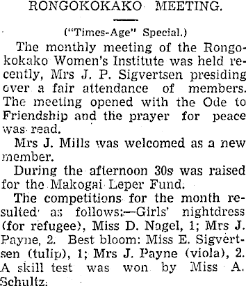 RONGOKOKAKO MEETING. (“Times-Age” Special.) The monthly meeting of the Rongokokako Women’s Institute was held recently, Mrs J. P. Sigvertsen presiding over a fair attendance of members. The meeting opened with the Ode to Friendship and the prayer for peace was read. Mrs J. Mills was welcomed as a new member. During the afternoon 30s 1 was raised for the Makogai Leper Fund. The competitions for - the month resulted a:; follows: —Girls’ nightdress (for refugee), Miss D. Nagel, 1; Mrs J. Payne, 2. Best bloom: Miss E. Sigvertsen (tulip), 1; Mrs J. Payne (viola), 2. A skill test was won by Miss A. Schultz.