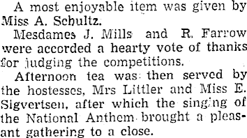 A most enjoyable item was given by Miss A. Schultz. Mesdames J. Mills and R. Farrow were accorded a hearty vote of thanks for judging the competitions. Afternoon tea was then served by the hostesses, Mrs Littler and Miss E. Sigvertsen, after which the sing; ng of the National Anthem brought a pleas- 1 ant gathering to a close. j
