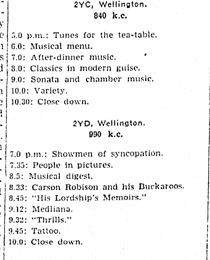 1 ‘ 2YC, Wellington. 840 k.c, - v i C 3.0 p.m.: Tunes for the tea-table. n GO: Musical menu. si 7.0: After-dinner music. d i 8.0: Classics in modern guise. - 9.0: Sonata and chamber music, a ! 10.0: Variety. C j 10.30: Close down. T . ‘ 2YD, Wellington, j 990 k.c. 11 ■ I 7.0 p.m.: Showmen of syncopation. i 7.35: People in pictures. ■8.5: Musical digest. , : 8.33: Carson Robison and his Buckaroos. | ' | 8.45: “His Lordship’s Memoirs." T 9.12: Medliana. ? ; 9.32: "Thrills.” . I 9.45: Tattoo. I 10.0: Close down. >! i