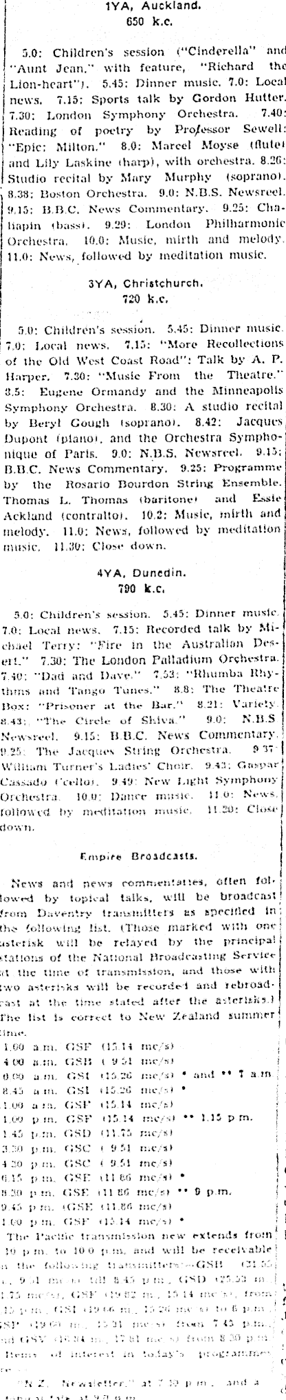 , IYA, Auckland. 650 k.C. 5.0: Children's session ("Cinderella'’ and "Aunt Jean." with feature, “Richard the Lion-heart’ ). 5.45: Pinner music. 7.0: Local news. 7.15: Sports talk by Gordon Hutter. 7.30: London Symphony Orchestra. 7.40: Reading of poetry by Professor Sewell: "Epic: Milton." 8.0: Marcel Moyse < flute) and Lily Laskine (harp), with orchestra. 8.20: Studio recital by Mary Murphy (soprano). 8.38; Boston Orchestra. 9.0: N.B.S. Newsreel. 9,15: BBC. News Commentary. 9.25: Chaliapin (bass). 9.29: London Philharmonic Orchestra. 10.0: Music, mirth and melody. 11.0: News, followed by meditation music. 3YA, Christchurch. 720 k.c. 5.0: Children's session. 5.45: Dinner music. 7.0: Local news. 7.15: “More Recollections of the Old West Coast Road”: Talk by A. P. Harper. 7 30: “.Music From the Theatre." 3.5: Eugene Ormandy and the Minneapolis Symphony Orchestra. 8.30: A studio recital by Beryl Gough (soprano). 8.42: Jacques Dupont tpianoi, and the Orchestra Symphoniqtie of Paris. 9.0: N.B.S. Newsreel. 9 15; 8.8 C. News Commentary. 9.25: Programme by the Rosario Bourdon String Ensemble. Thomas L Thomas (baritone l and Essie Ackland (contralto). 10,2: Music, mirth and melody. 11.0: News, followed by meditation j music. 11,30: Close down. 4YA, Dunedin. 790 k.c. 5.0: Children's session. 5.45: Dinner music 7.0: Local news. 7.15: Recorded talk by Michael Terty: “Fire in the Australian Resell." 7.30: The London Palladium Orchestra. 7W. "Dad and Dave ” 7.53: “Rhumba Rhythms and Tango Tunes.” 8.8: The theatre Box: ’-prisoner at the Bur. ’ 8.21: Variety. 8.43: ’*‘l !•.«- Ctirele of fslsiva. ' 9.0: N.B.S Newsreel. 9.15: H B.C. News Commentary 11.25 The Jacques String Orchestra 937 I Wdltam Turner's Ladies.- Choir. 9<V Gnsyarl Cieisado (\<llo>. 9 49: New Light Symphoie. < Orchestra lOu; Dimer mu-m lit” News j followed by meditation music 11.3): Closej down. Ernpire Broadcasts. News and news commeniaiies. often fol-, lowest by topical talks, will be broadcast'' from Daven'.ry transinltteis tis specitled in: the 'olluwlni! list. (Those marked with <w | asterisk will be relayed by the principal! stations of the National Brvadrastmg Service - at the time of trumunls»ion. and those with two asterisks will be recordei and rebroad- i east at '.ba- time states! after the a-.lcrisio.) • . The list i» correct to New Zealand summer ' 1.00 am GSF fl' H mc.’s) 4WJ a m tISII t 9 :-1 mc/si 0.00 a 111. Ght <’. 2C tm :> * and ” 7 a m li 45 am. GSt >;:. me- ' * ll.Wl am, GSI‘ i 15,14 me S) l.C<) pm. GSF 115 14 me. -< •* 1.13 pm. !45 i< :n. GSD ’ll 7:< r:» I ■ ;i :.i pm < ISC < 951 n.c s> •> 20 p m C.SC ( 951 flit s! } < p m GSE ill t“’> me si • b: i pm. GSE 111 Efi me si ” 9 pm. y pm iGSI" iII.EC rnc.'j) :1 CO pm. GSl’ ! 1 14 me si • Tin- I’acUi.- transmission new extends from ! : IO pm iOil i-m.l will lie receivable: •c. Hie .mg I: -m.'.’.-r- GSt! <3! u . 9.: :■ ■ - m . GSD u :y. m< GhF -19 ns ■■■■ . m< ■■ , •. . '.. <; -.! <»• m ■■l■r 1- rn y ,S’’ tt : lit ir.v frc«n 7 4.5 p.m.,J .•. rj (i S\ -b• -' < Ji- jTUI D •' ' j f2’ •' S .'< p ' r.min «/! if;!*-:, at .t\ tmt-it, - : ‘m r ,’i Z. ’< t ji c!! rf’ 41 ffi . A 4 $ ! • I 41 t. 3 • ► I- gs