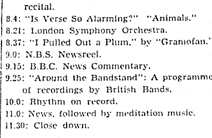recital. j 8 4: "Is Verse So Alarming?" "Animals." j 8.21: London Symphony Orchestra. | 5.37: "I Pulled Out a Plum.” by "Gramofan." | 9.0: N.B.S. Newsreel. I 9.15: 8.8. C. News Commentary. : 9.25: "Around the Bandstand": A programme I of recordings by British Bands. j 10.0: Rhythm on record. J 11.0: News, followed by meditation music. ! 11.30: Close down.