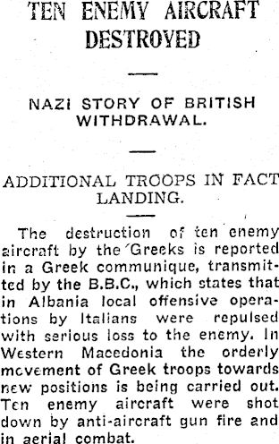 TEN ENEMY AIRCRAFT DESTROYED NAZI STORY OF BRITISH WITHDRAWAL. ADDITIONAL TROOPS IN FACT LANDING. The destruction of ten enemy aircraft by the Greeks is reported in a Greek communique, transmitted by the 8.8. C., which states that in Albania local offensive operations by Italians were repulsed with serious loss to the enemy. In Western Macedonia the orderly movement of Greek troops towards new positions is being carried out. Ten enemy aircraft were shot down by anti-aircraft gun fire and in aerial combat.